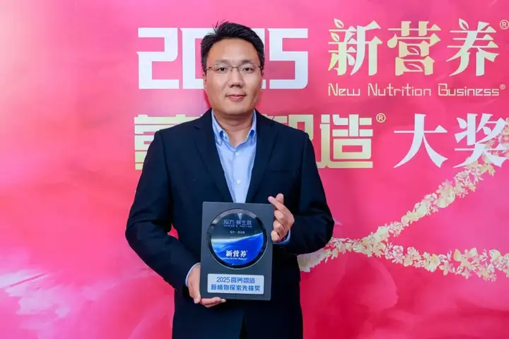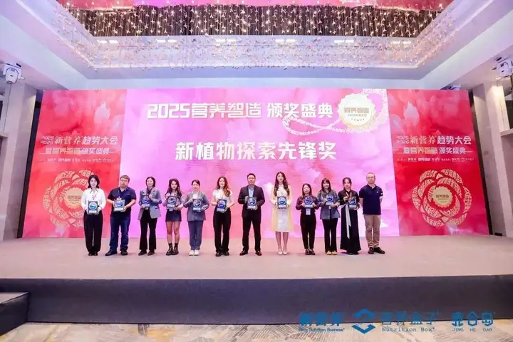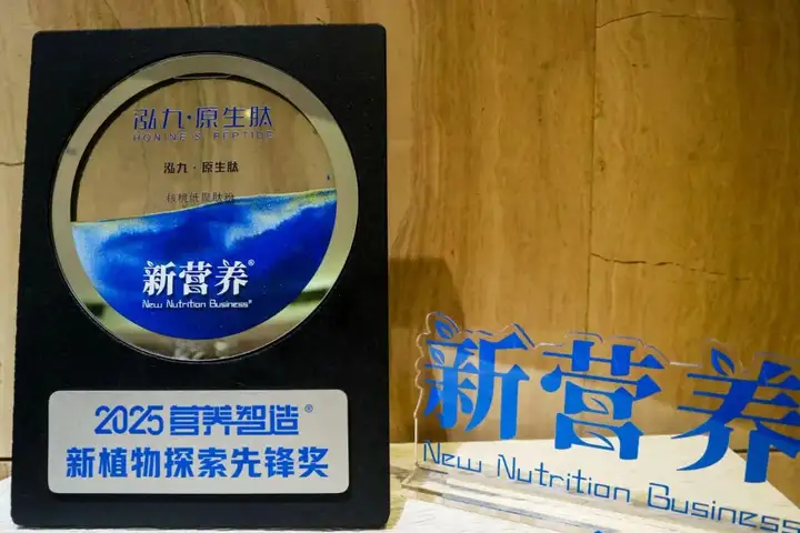 2025年11月6日,由新营养、营养智造、竞合岛联合主办,营养盒子与新植物共同协办的“2025-2026新营养年度趋势大会暨营养智造颁奖盛典”在广州盛大举行。泓九原生肽作为“2025营养智造大奖百强入围企业”受邀出席,并凭借核桃低聚肽粉在植物功能成分创新与应用领域的卓越贡献,荣获大会“2025营养智造新植物探索先锋奖”。