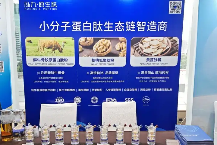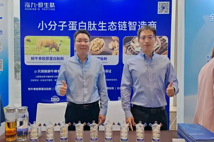 在本次盛会上,泓九原生肽携多款明星产品亮相,包括鲜牛骨胶原蛋白肽粉、牦牛骨胶原蛋白肽粉、黄芪肽粉及荣获本届大奖的核桃低聚肽粉。其中,核桃低聚肽粉凭借甄选原料、全流程标准化质控体系,以及三级冷榨脱脂提取工艺,展现出优越的营养稳定性与生物活性,吸引了众多采购商与行业专家的关注。现场观众围绕产品性能、应用方向与合作模式展开深入交流,达成多项合作意向。